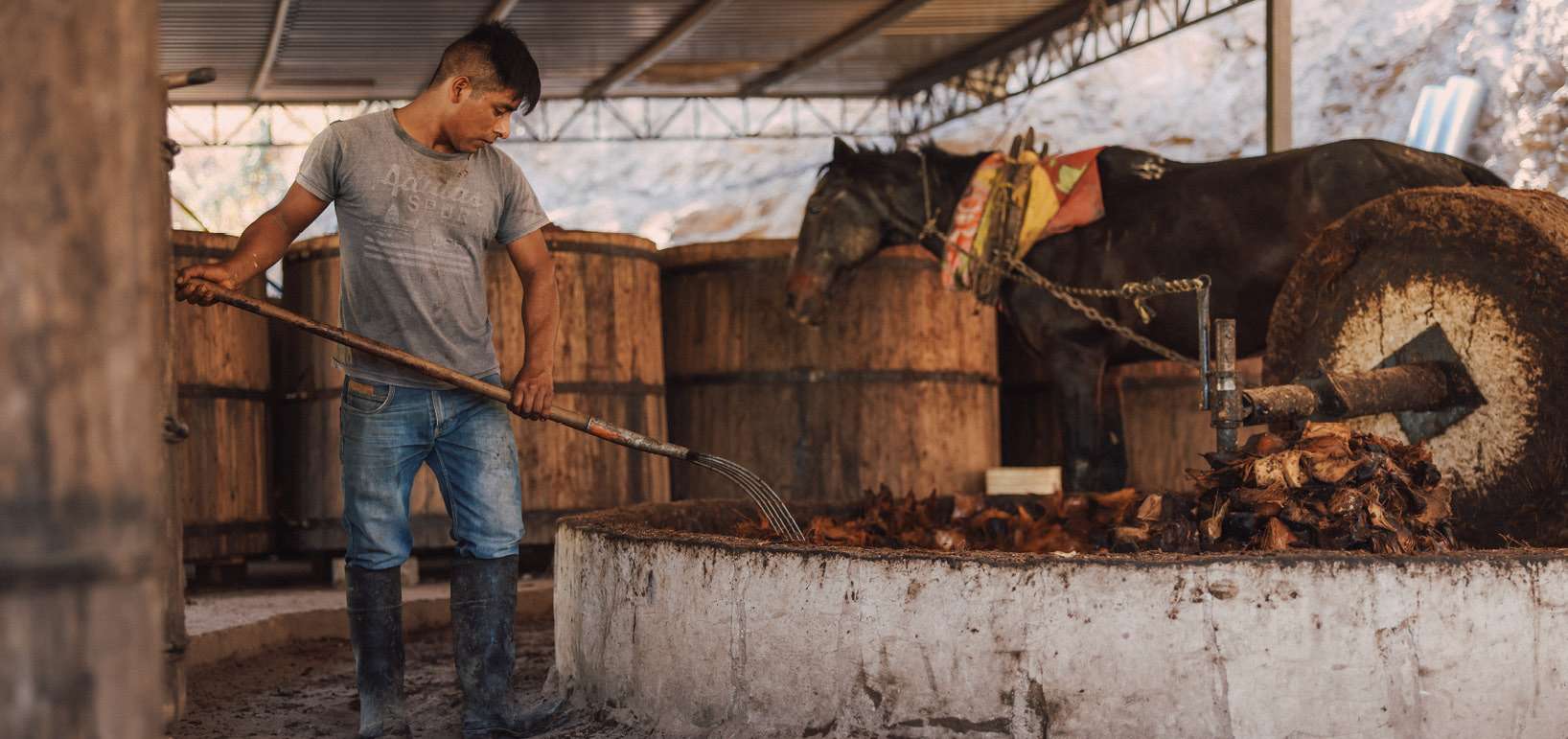 The cooked agave piñas must be crushed in order to make the sugars and flavors availabe for fermentation. This is accomplished laboriously with a stone wheel called a molino, which is powered by a horse or donkey. The pieces of agave must constantly be pushed into the path of the wheel until crushing is complete.
