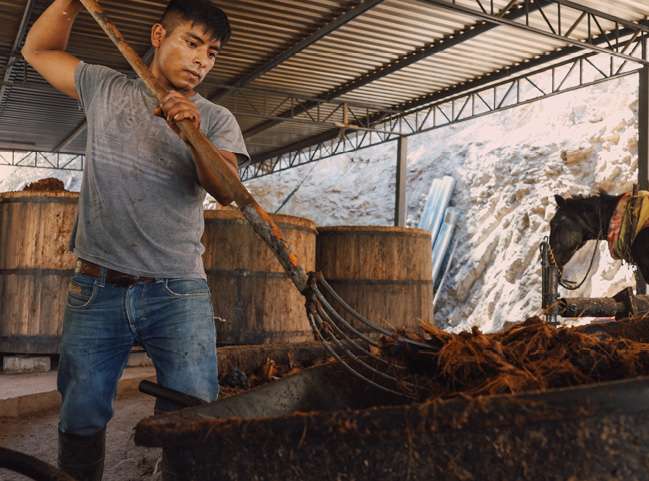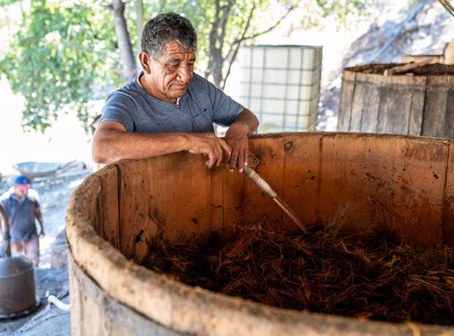 The crushed agave is transferred to wooden fermentation vessels and water is added. Wild yeasts and bacteria from the air colonize the sweet liquid and perform a wild fermentation over many days, converting the agave sugars into alcohol.