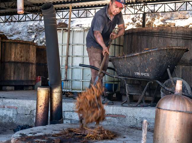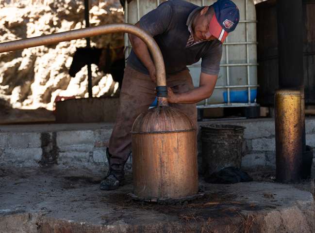 When fermentation is complete, the liquid, along with the agave fibers, are moved into an alembic copper still. The liquid is heated and the vapor collected. This distillation is performed twice, and with each pass, the alcohol is increased. The heart of the second distillation is our mezcal.
